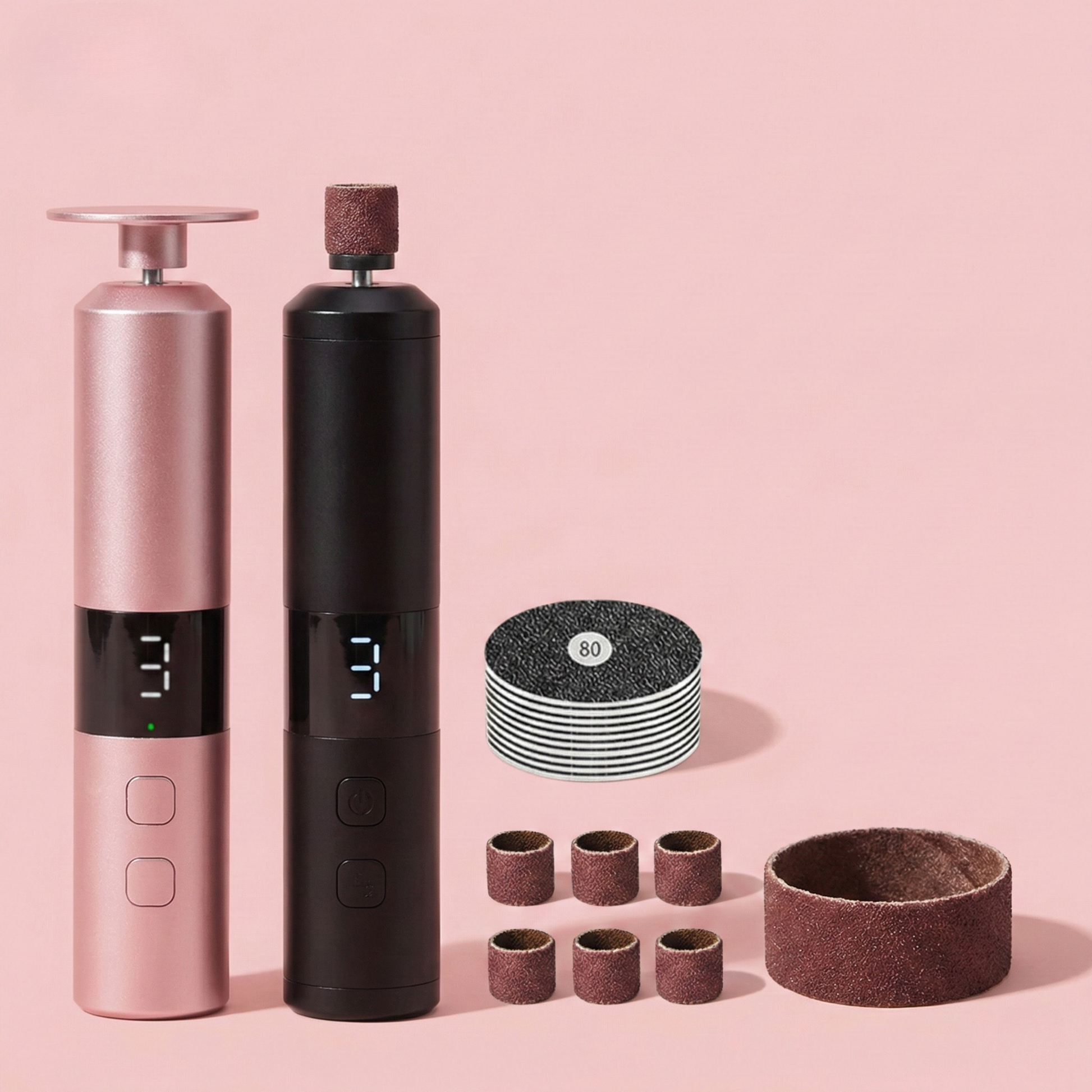 💅 Kit 2-en-1 Polyvalent : Bien plus qu'une simple lime, il se transforme en véritable ponceuse à ongles grâce à ses embouts interchangeables (inclut 10 disques de polissage et 6 bagues de finition).